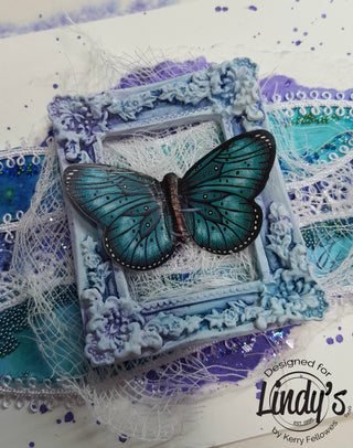 - Kaisercraft stamps, Archival Ink, Resin Frame, Butterfly sticker, lace and gimp, glass glitter, stickles, microbeads, gauze, watercolor paper, 3D foam tape, white gesso and glue gun.
