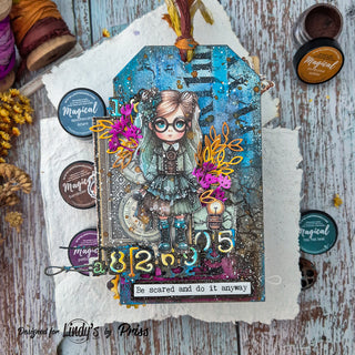 I used the Magicals Steampunk Soiree Set to craft a stunning double-sided tag. This tag will serve as the cover for my tag album, which I already have full of awesome projects from some of the past Lindy’s Color Challenges. So keep an eye on my Instagram because soon I will show you a flip-through of this tag album.