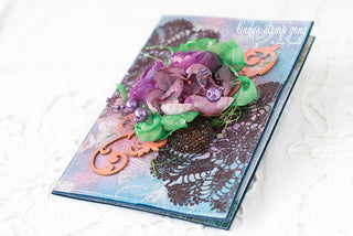 I’ve painted the chipboard swirl with Cana Lily Burnt Orange spray. The ribbon was painted with the Lucky Shamrock Green spray. I’ve added more color to the flowers with the Sweet Violet Purple spray.