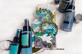 - Paint the upper part above the leaves with Green With Envy Green spray, leaving a small piece of white. Color the leaves and lower part of the tag with Black Orchid Silver spray