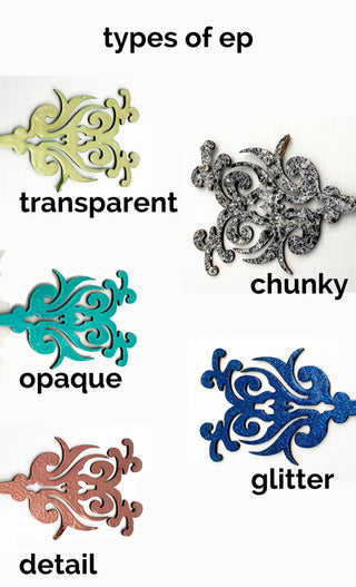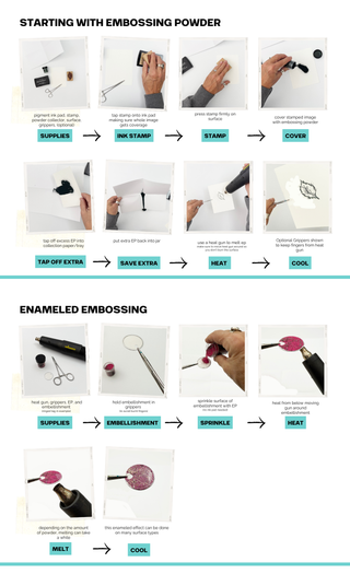 - Embossing powders (EPs) are used in conjunction with a heat gun that melts the powder onto your surface, (most surfaces work great)